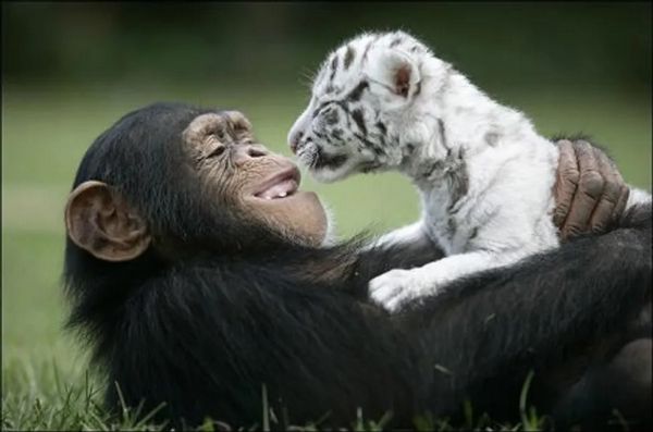 Chimp Anjana became the doting surrogate parent to two abandoned tiger cubs named Mitra and Shiva. The baby tigers were separated from their mother after a hurricane, so the ape sanctuary had Anjana care for them.