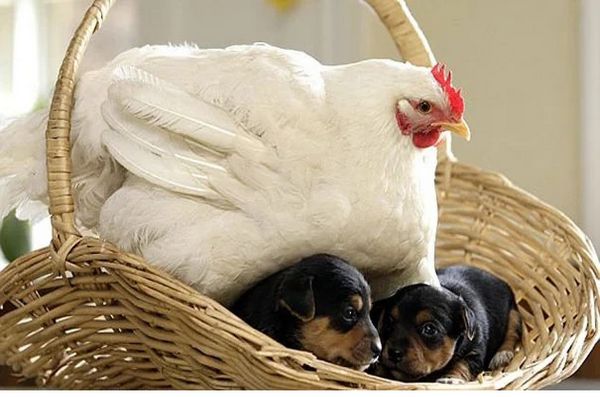 When Nettle gave birth to pups and stepped out, maternal Mabel went right over to keep the newborn puppies warm and cozy like they were her own chicks! Now that’s an unusual crossover friendship.